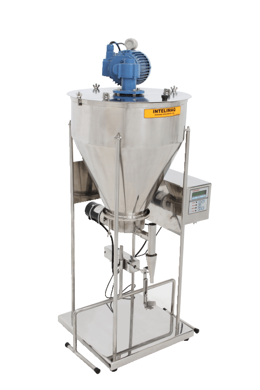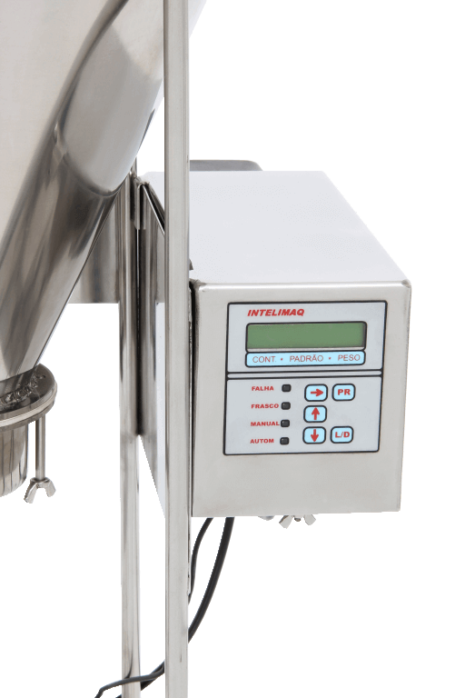O frasco ou sachê é posicionado manualmente em um suporte embaixo do bico, o processador verifica a existência do frasco sobre a célula da balança e efetua o envase com o peso programado. Caso não haja frasco não libera o material.